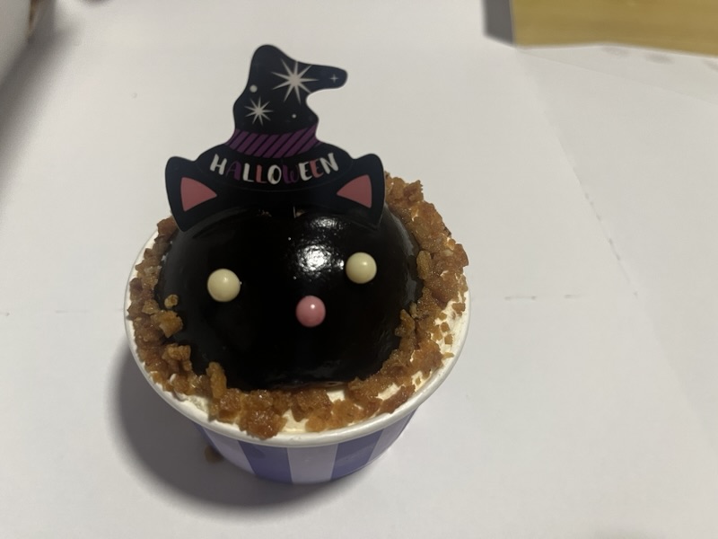 シャトレーゼのハロウィン的な黒猫ケーキ。写真の撮り方がちょっとアレなだけで、実際見るともっとかわいいってことで!